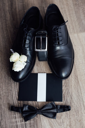 Black bow tie lies before leather shoes and belt. Grooms wedding morning