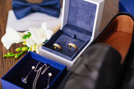 Close up of modern groom accessories. wedding rings in a brown wooden box, necktie, leather shoes and watch