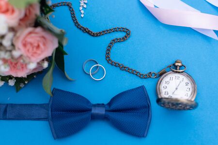wedding bouquet and wedding rings on a background of blue paper with a man's butterfly and an old clock on a chain top view of flat Lay