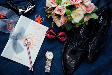 Close up of wedding bow tie, belt and groom shoes on floor waiting for wedding day, panorama