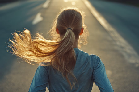 Sunlit Road: Detailed Back View of Female Runner in Action