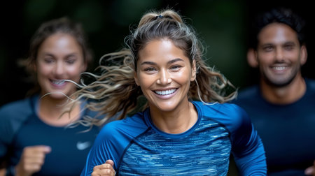 Portrait of a happy couple in sportswear looking at camera and smiling while running outdoors