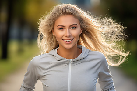 A woman with her hair blowing in the wind. Blonde woman in a tracksuit jogging. A woman goes in for sports. Sports training