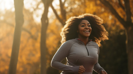 Young African American plump woman jogging through an autumn city park. Weight loss running workout. A morning boost of energy on the way to your goal. Active and healthy lifestyle.