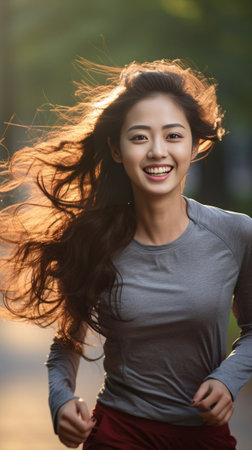 Young woman jogging in a vibrant park during sunset with a determined expression. Generative AI