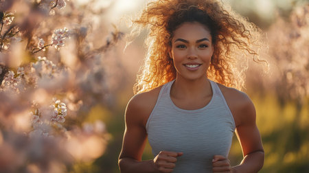 Runner enjoying spring blossoms during evening workout in a vibrant field. Generative AI