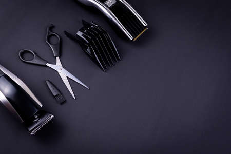 Barber shop equipment on Black background . Professional hairdressing tools.