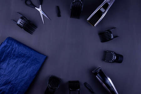 Professional hairdressing tools, hair clipper with attachments and scissors on a blue background. Place for text. Copy space
