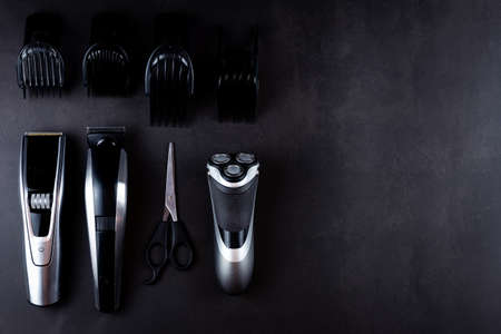 Shaving, Razor, brush, Comb, scissor, clippers and hair trimmer. Accessories for Barber shop equipment on black background Top view copyspace