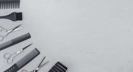 Professional tools for a barber shop on a gray background. Top view. Space for text