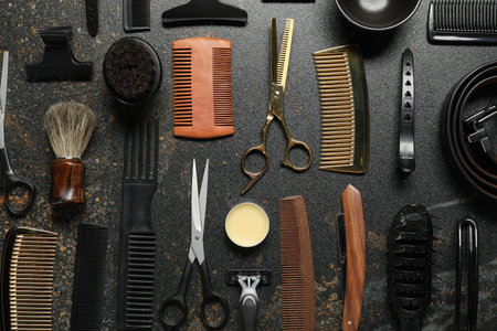 Barber shop equipment set isolated on black table background. Close up sccissors, comb, brushes, razors, professional tools of hairdresser. Professional occupation, art, self-care concept. Magazine.