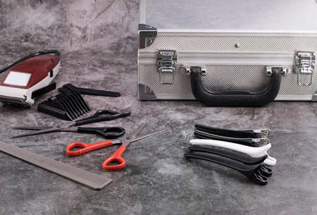Set of professional hairdresser tools on grey background. Wooden table in barbershop. Working tool of barber master