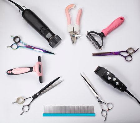 Tool for the groomer on a white background. dog grooming accessories. Scissors for cutting animals. View from above