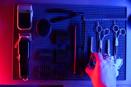 Barber tools. Scissors, combs for hair and beard, hair clipper are lying on a rubber mat in the barber shop. Top view. Web banner