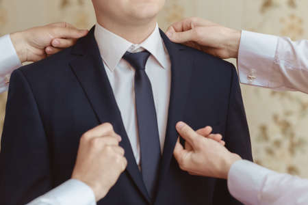 Groomsman helps to wear a jacket to the groom in room. Shallow depth of field.