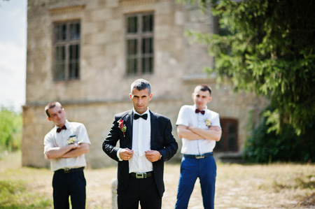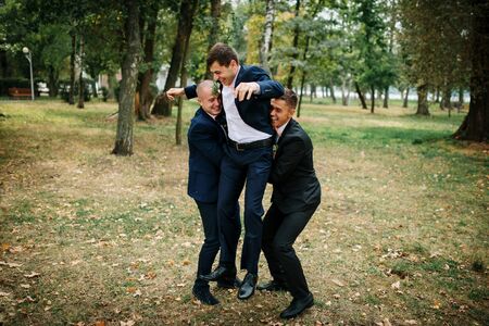 Three friends, groom with groomsman having fun