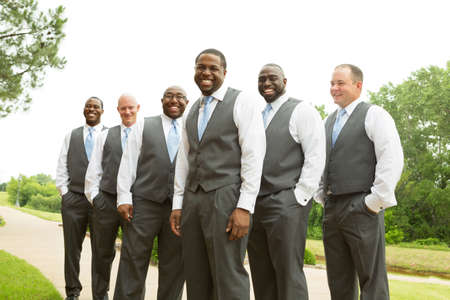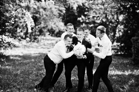 Handsome groom with his groomsman on the backyard. Five man. Groom dressed in suit, gromsmen in white shirt. Funny guys on the wedding