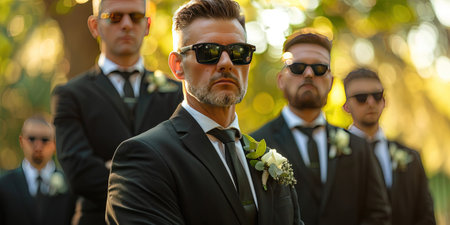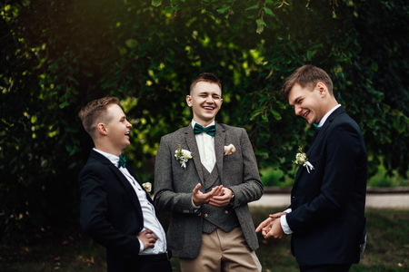 The groom and his friends celebrate the wedding. Men in suits. Mens emotions and friendship.