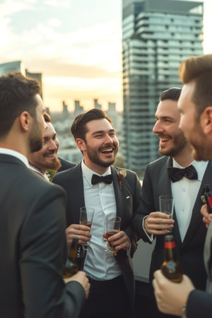 Bachelor party vibes with the groom and pals in a rooftop bar, enjoying panoramic views and laughter in the night of jubilation.