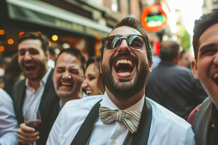 Wild bachelor party antics with friends in a bustling city, celebrating the groom-to-be's last days of singledom with laughter and joy.