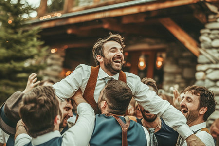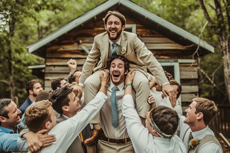 Whimsical bachelor party moment as the groom is hoisted on shoulders by friends in a rustic setting.