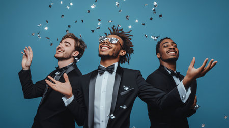 Three happy elegant men enjoying a party with falling confetti on a vibrant blue background