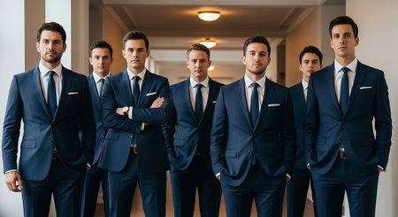 Seven men in matching navy blue suits with white shirts and ties pose confidently in a row indoors.