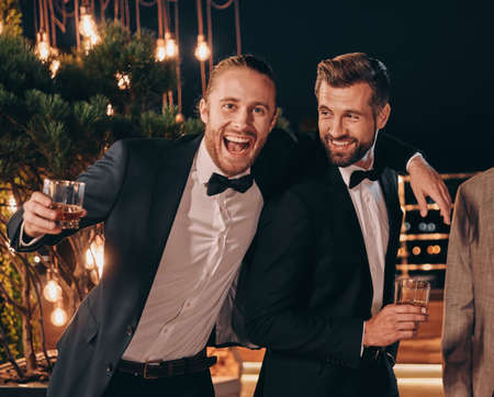 Two handsome men in suits drinking whiskey and smiling while spending time on party
