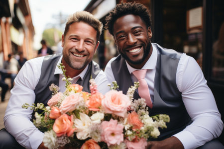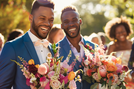 Happy cheerful gay grooms hugging on their wedding day. Male gay couple surrounded with flowers. Homosexuality, same-sex marriage and love concept. Generative AI.