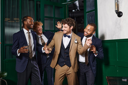 bachelor party, multiethnic best men and groom laughing while standing with glasses of whiskey