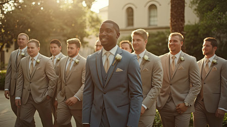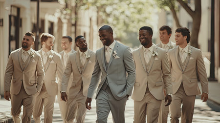 the groom donning a bluish-gray suit, surrounded by groomsmen clad in coordinating beige suits, each exuding their unique charm and personality