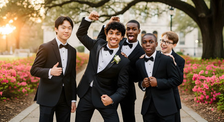 A happy and diverse group of five teenage boys in black tuxedos and bow ties pose together outdoors for a prom or formal event. They are smiling and making fun, celebratory gestures in a park setting with pink flowers and a setting sun.