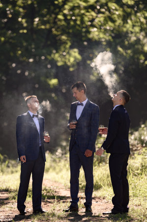 Ivano-Frankivsk, Ukraine October 2, 2021: The groom and his friends smoke cigarettes in the garden, holding glasses of champagne.