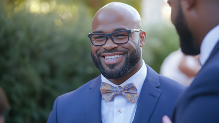 A stylish man with a bow tie and glasses smiles warmly at an outdoor event. The relaxed atmosphere and greenery create a cheerful and elegant backdrop.