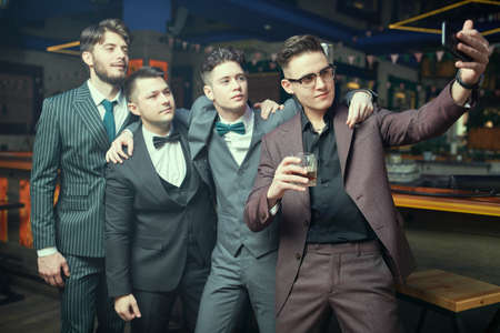 Group of handsome young men dressed in elegant classic suits relax in a bar and take a selfie. Men's fashion. Business people club.