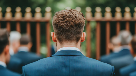 Groom at outdoor wedding.