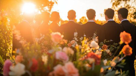 Graduates pose together in formal attire during a picturesque sunset. Vibrant flowers enhance the joyful atmosphere, celebrating their achievements.