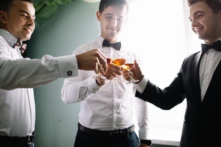 Groom and his groomsmen friends in stylish suits drinking whiskey in hotel room. Morning before the wedding preparation. Group of friends celebrating.