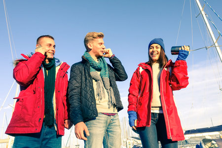Sailing trip friends having fun before embark on boat at pier - Woman holding primitive phone for funny joke to men - Students enjoy sunny weekend at yachting harbour - Friendship and joy concept