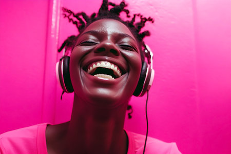 Joyful woman listening to music with headphones against a vibrant pink background.