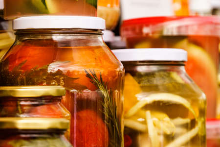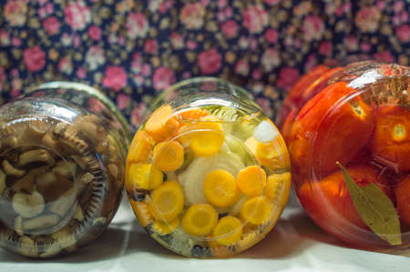 Food preserving for autumn winter time. Jars with pickled vegetables. Food fermentation.