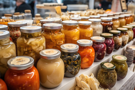 A display of jars of pickled vegetables jams and pickles at a traditional country store located within a farmers market