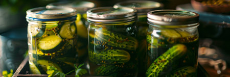 Canned pickled cucumbers in jars closeup, homemade pickles, canning food, marinated cucumbers, canning vegetables selective, focus, generative ai illustration