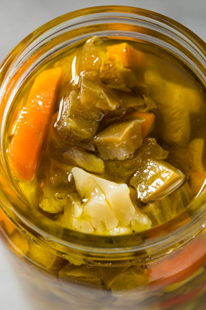 Spicy Homemade Chicago Giardiniera Peppers in a Jar with Oil