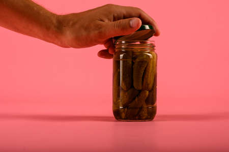 Tasty canned food concept, canned cucumbers, food for winter