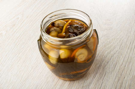 Opened transparent glass jar with marinated mushrooms on wooden table