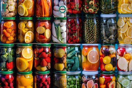 A vibrant arrangement of jars filled with preserved fruits and vegetables showcases the art of canning, bringing warmth and color to a charming kitchen atmosphere.