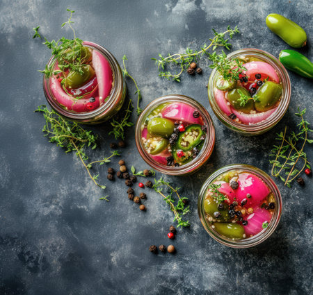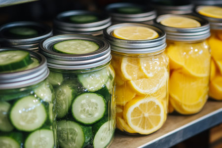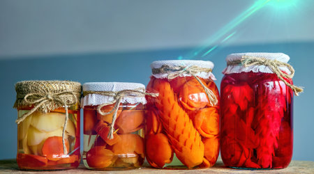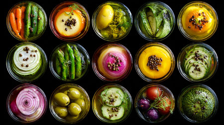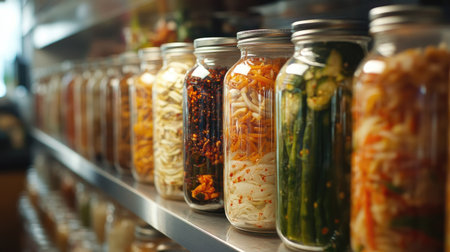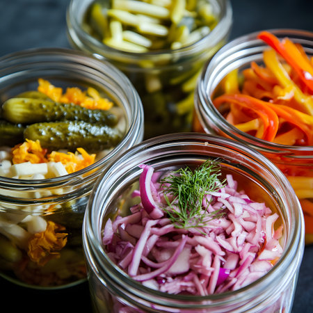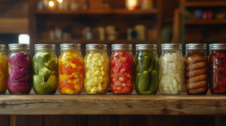 A visually appealing arrangement of jars filled with preserved vegetables, showcasing vibrant colors and textures, perfect for culinary inspiration in any home kitchen setting.