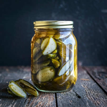Closed jar of pickles. On dark rustic background