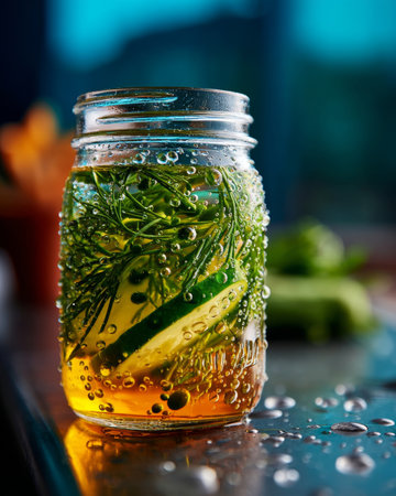 Macro photograph of pickles and dill inside a mason jar filled with golden brine, covered in condensation droplets, placed on a reflective surface.